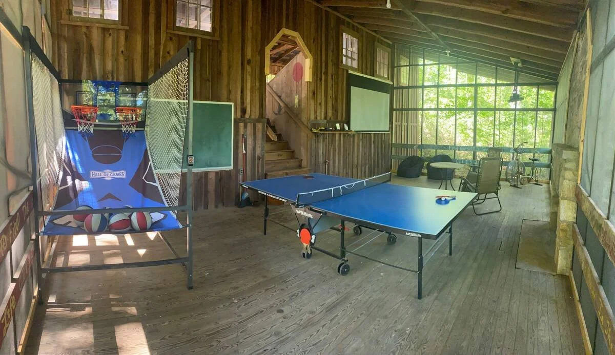 The lower level of the “Rec Shack” has a large, screened-in porch, a ping-pong table, and an arcade-style basketball hoop shoot. There’s also a large movie screen, a projector, and bean bag chairs, perfect for enjoying an evening of popcorn and movies.