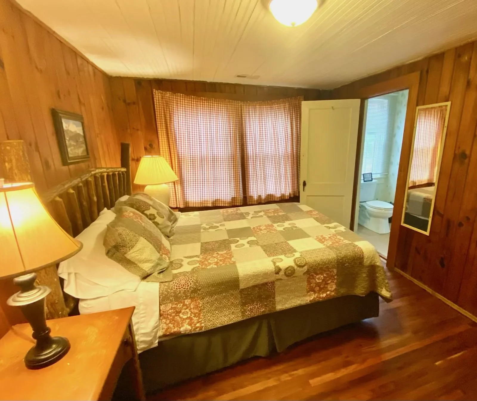 The Lodge has two queen primary bedrooms, connected by a jack-and-jill bathroom with a shower and a single sink vanity. Both of these queen bedrooms have closets, full-length mirrors, and bedside tables with reading lamps. One Queen suite has a Roku TV. Homey mountain touches in these bedrooms include a log-pine headboard, handmade quilts, vintage-style checkered curtains, and warm, woodsy ambiance with original pine paneling and floors.