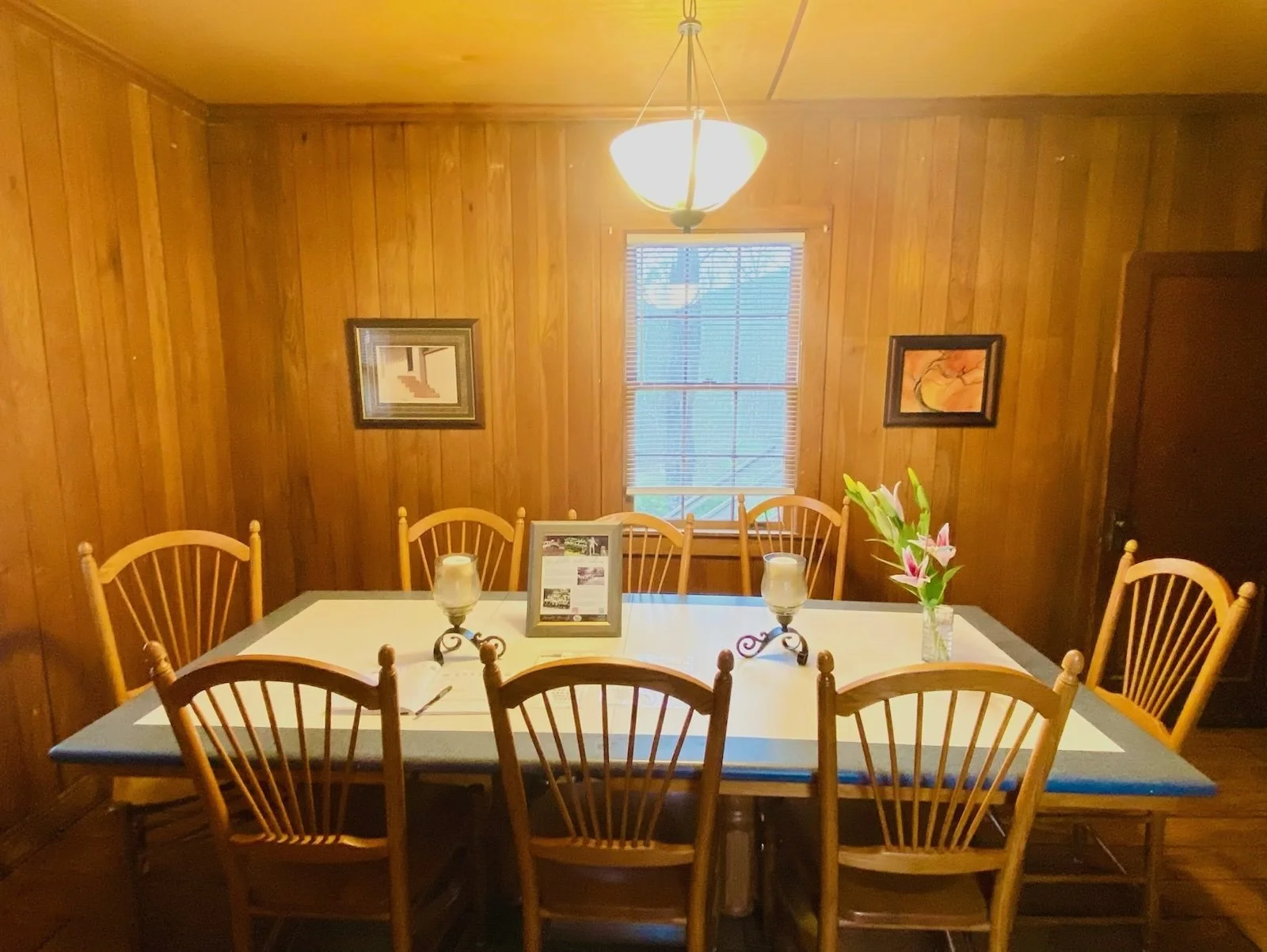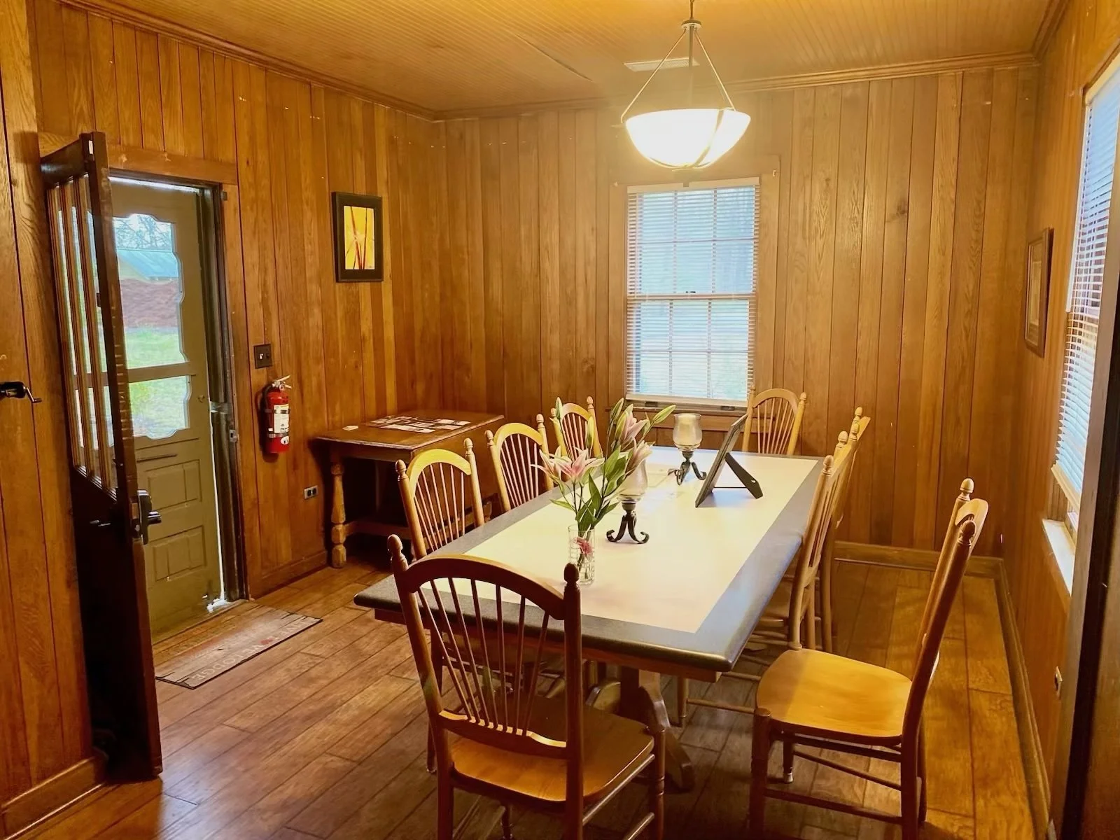 The dining room is at the front entry, just off the kitchen. The dining room has a large, sturdy dining table with seating for eight, under a modern wrought-iron chandelier. This dining room is warm and inviting with original wide-plank pine floors and tongue and groove pine paneling. Large windows allow plenty of natural light. Gather your troops here for a family-style meal.