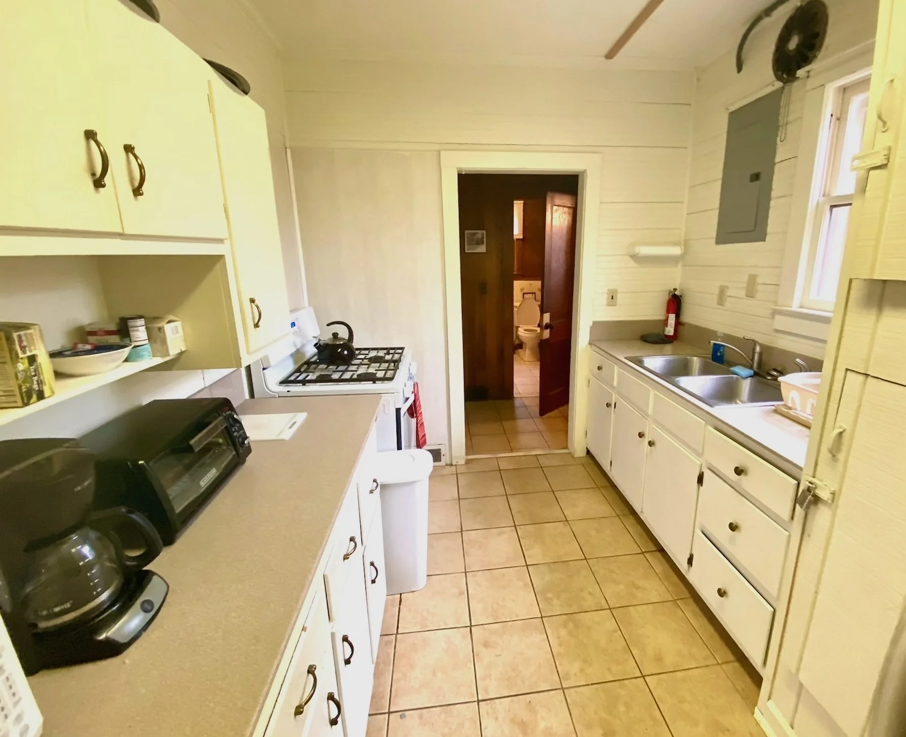 The third bedroom is really a “kid’s bedroom”, which served as the old Scout Camp bunk room. There are three comfortable XL twin beds in this room. The large windows have light, gauzy curtains. One wall of this third bedroom boasts original built-in cabinets, constructed from natural grain wood. These cabinets are decorated with signatures, troop slogans, drawings, and cheerful Girl Scout graffiti dating from the 1950s through the 1990s.