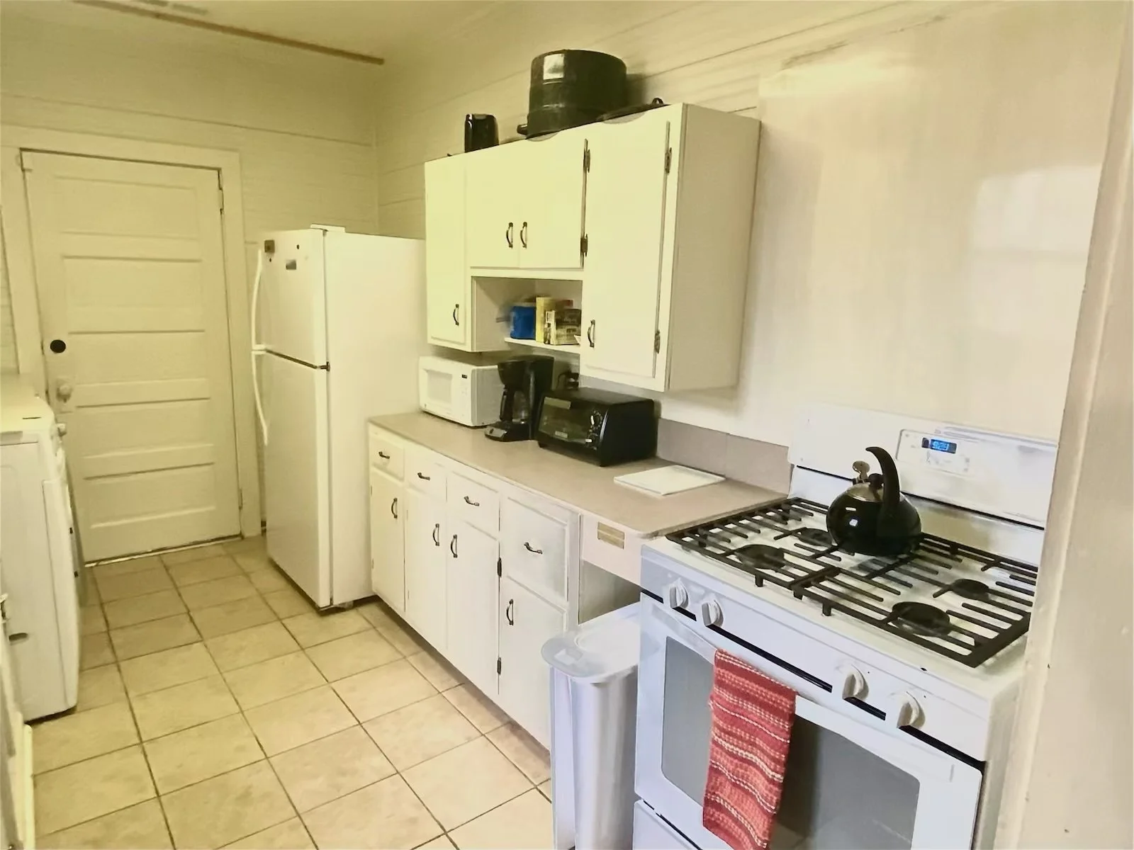 The fully stocked kitchen has a gas stove and oven, double basin sink, full-size fridge, microwave, toaster, coffeemaker, and plenty of dishware, glassware, pots, pans, utensils, and cutlery. Plenty of shelving accommodates all your staples. A large capacity washer and dryer are also in the kitchen.