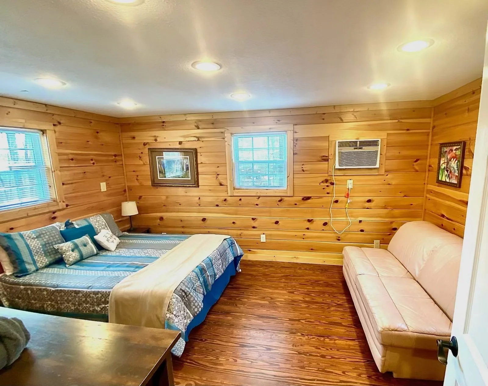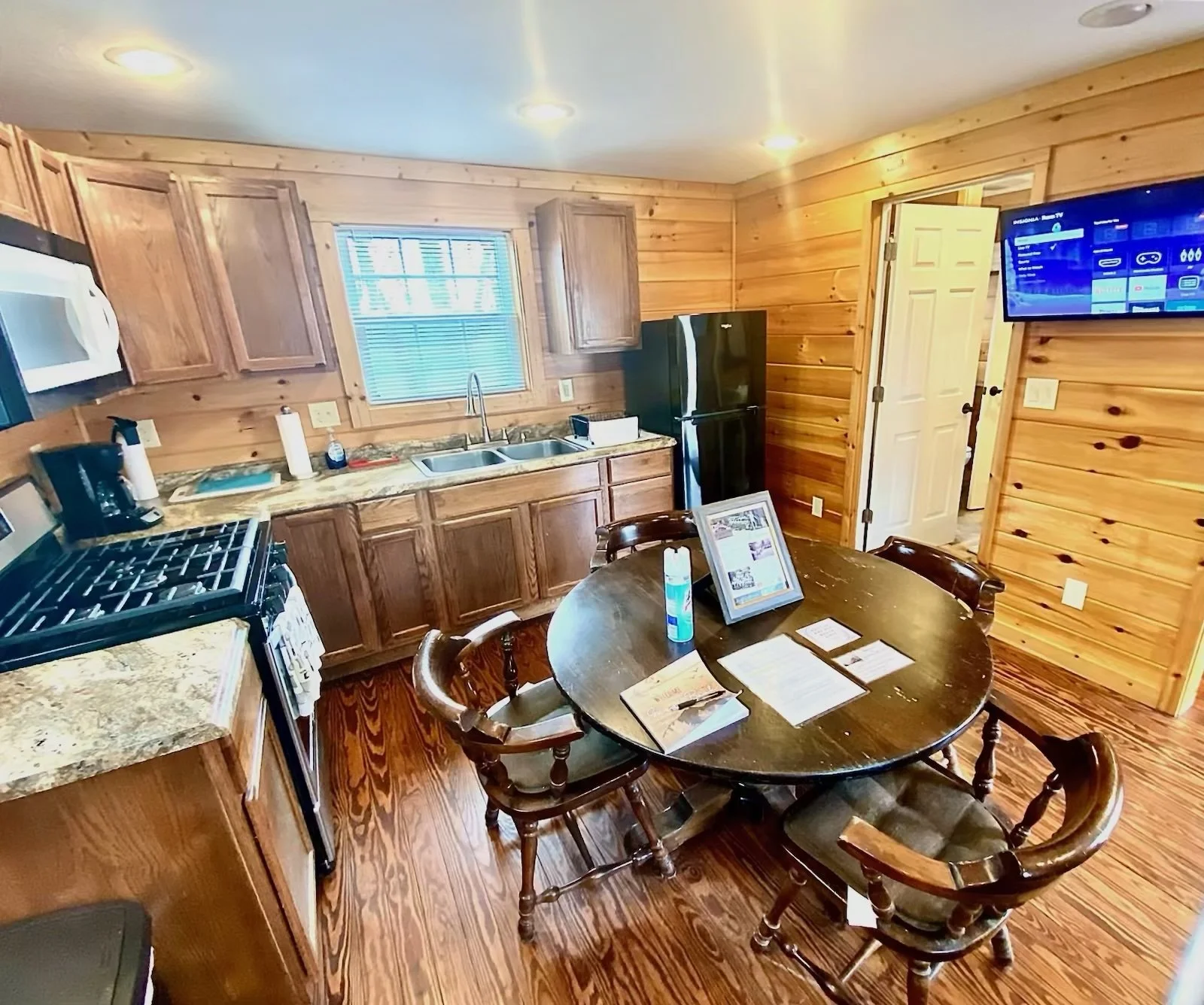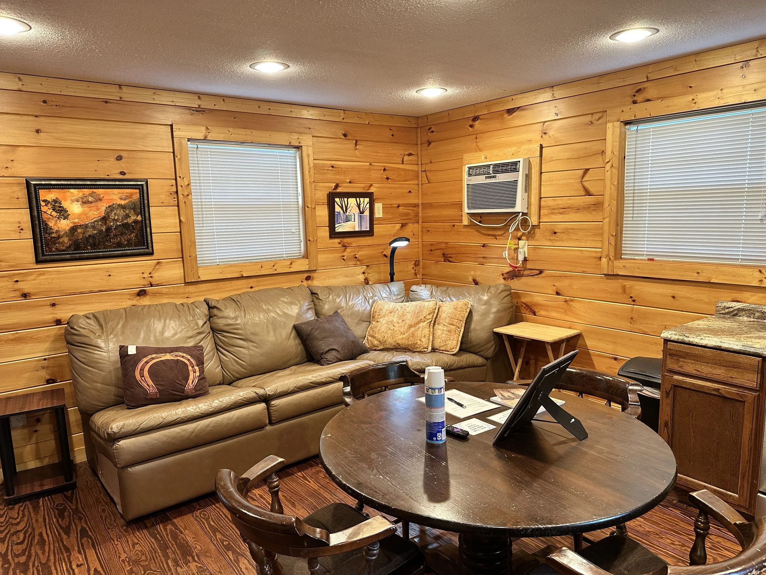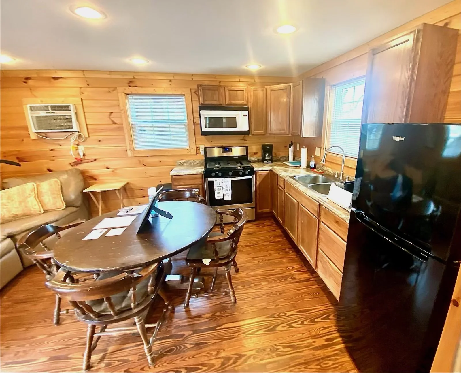 The main kitchen/dining/living room has been updated with golden-hued pine paneling. This living area has a plush sectional sofa, a Roku TV, as well as a dining table with four chairs. Enjoy the comfort of central air conditioning, or curl up on the sofa under throw blankets as you dive into a good book, or stream your favorite shows and movies on the SmartTV. Need to work remotely? WiFi is superfast!