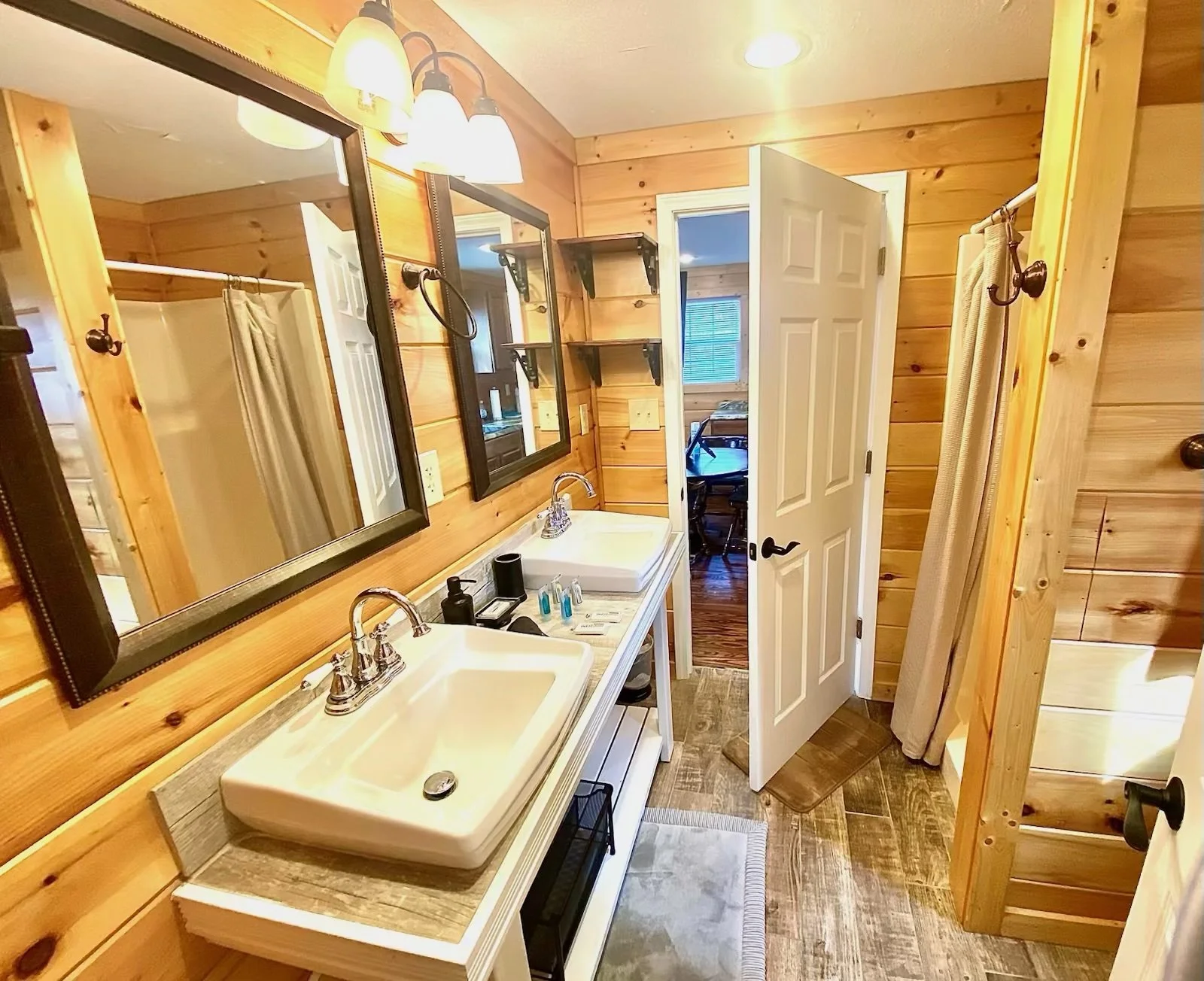 The Cottage bathroom has a step-in shower, a beautifully designed double-sink vanity, and two stylish well-lit mirrors. The bathroom has simple shelving, as well as a stackable washer/dryer. The bathroom is equipped with a hairdryer and basic toiletries. Extra beach towels are provided for the Hot Tub.